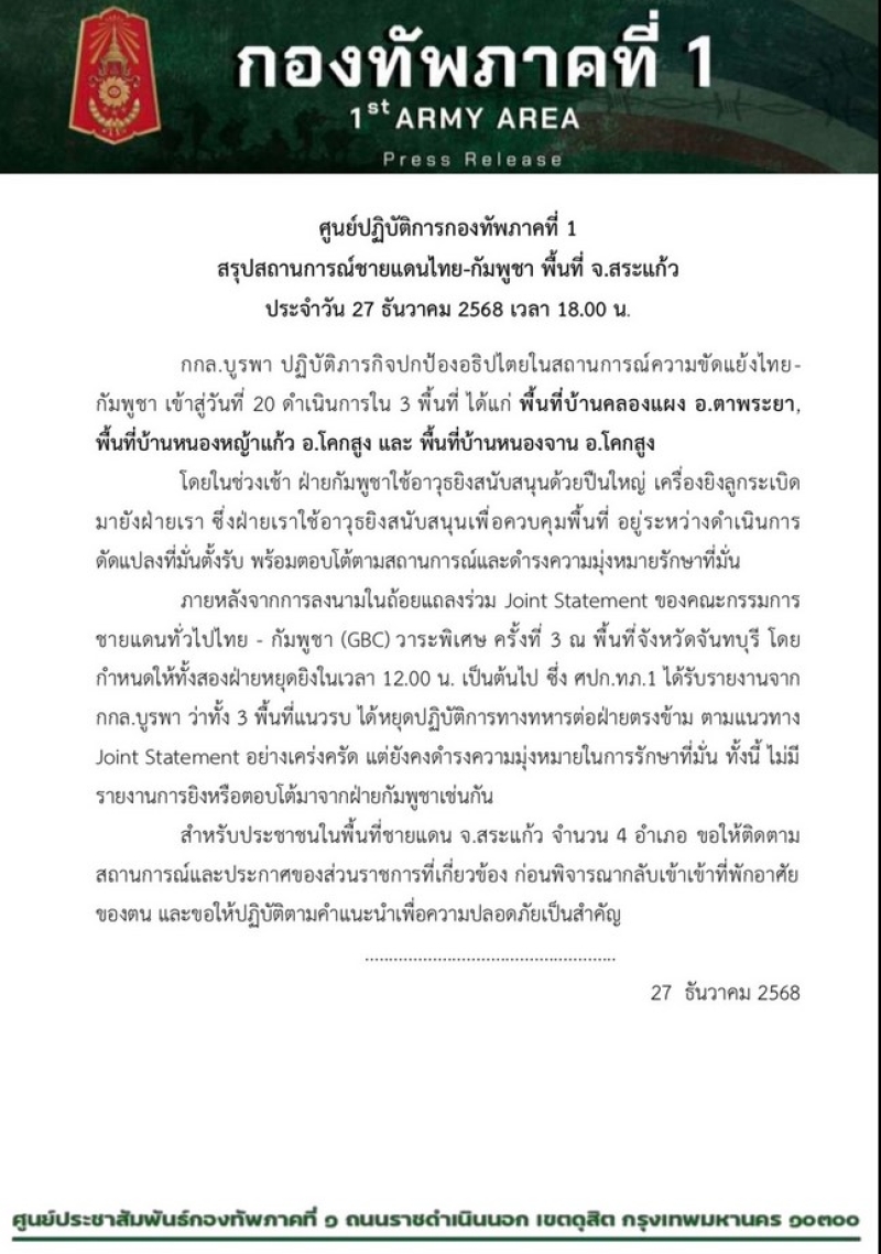 ศูนย์ปฏิบัติการกองทัพภาคที่ 1 สรุปสถานการณ์ชายแดนไทย-กัมพูชา พื้นที่ จ.สระแก้ว ประจำวัน 27 ธันวาคม 2568 เวลา 18.00 น.