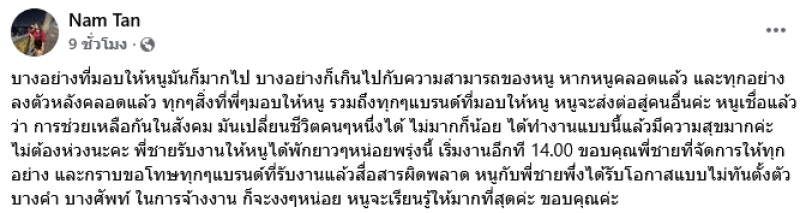 หนูเชื่อแล้วว่า การช่วยเหลือกันในสังคม มันเปลี่ยนชีวิตคนๆหนึ่งได้ ไม่มากก็น้อย ได้ทำงานแบบนี้แล้วมีความสุขมากค่ะ ไม่ต้องห่วงนะคะ พี่ชายรับงานให้หนูได้พักยาวๆหน่อยพรุ่งนี้ เริ่มงานอีกที 14.00. ขอบคุณพี่ชายที่จัดการให้ทุกอย่าง และกราบขอโทษทุกๆแบรนด์ที่รับงานแล้วสื่อสารผิดพลาด หนูกับพี่ชายพึ่งได้รับโอกาสแบบไม่ทันตั้งตัว บางคำ บางศัพท์ ในการจ้างงาน ก็จะงงๆหน่อย หนูจะเรียนรู้ให้มากที่สุดค่ะ ขอบคุณค่ะ