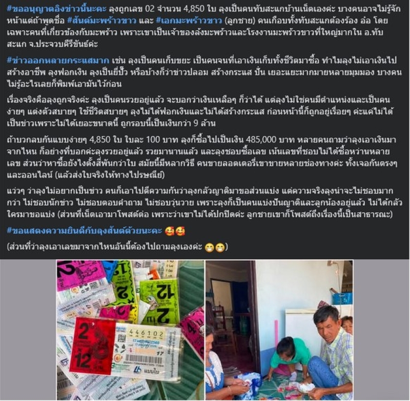 ล่าสุดมีผู้ใช้เฟซบุ๊กรายหนึ่ง เปิดเผยข้อมูลเพิ่มเติมเกี่ยวกับตัวตนของผู้ถูกรางวัล พบว่ามีอาชีพและฐานะมั่นคง เป็นผู้มีทรัพย์สินอยู่แล้ว โดยระบุว่า ขออนุญาตอิงข่าวนี้นะคะ ลุงถูกเลข 02 จำนวน 4,850 ใบ ลุงเป็นคนทับสะแกบ้านเน็ตเองค่ะ บางคนอาจไม่รู้จักหน้าแต่ถ้าพูดชื่อ สันต์มะพร้าวขาว และ เอกมะพร้าวขาว (ลูกชาย) คนเกือบทั้งทับสะแกต้องร้อง อ๋อ โดยเฉพาะคนที่เกี่ยวข้องกับมะพร้าว เพราะเขาเป็นเจ้าของล้งมะพร้าวและโรงงานมะพร้าวขาวที่ใหญ่มากใน อ.ทับสะแก จ.ประจวบคีรีขันธ์ค่ะ