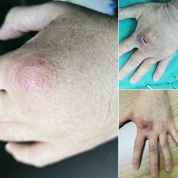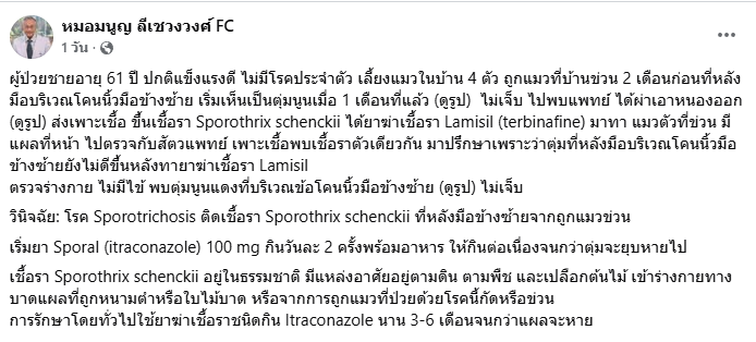 วันที่ 18 มี.ค.69 ที่ผ่านมา เฟซบุ๊ก “หมอมนูญ ลีเชวงวงศ์ FC” โพสต์เตือนภัยคนเลี้ยงแมว หลังมีคนถูกกัดจนเริ่มมีอาการผิดปกติที่บาดแผล สุดท้ายกลายเป็นติดเชื้อรา Sporothrix schenckii โดยระบุว่า ผู้ป่วยชายอายุ 61 ปี ปกติแข็งแรงดี ไม่มีโรคประจำตัว เลี้ยงแมวในบ้าน 4 ตัว ถูกแมวที่บ้านข่วน 2 เดือนก่อนที่หลังมือบริเวณโคนนิ้วมือข้างซ้าย เริ่มเห็นเป็นตุ่มนูนเมื่อ 1 เดือนที่แล้ว (ดูรูป) ไม่เจ็บ ไปพบแพทย์ ได้ผ่าเอาหนองออก (ดูรูป) ส่งเพาะเชื้อ ขึ้นเชื้อรา Sporothrix schenckii ได้ยาฆ่าเชื้อรา Lamisil (terbinafine) มาทา แมวตัวที่ข่วน มีแผลที่หน้า ไปตรวจกับสัตวแพทย์ เพาะเชื้อพบเชื้อราตัวเดียวกัน มาปรึกษาเพราะว่าตุ่มที่หลังมือบริเวณโคนนิ้วมือข้างซ้ายยังไม่ดีขึ้นหลังทายาฆ่าเชื้อรา Lamisil ตรวจร่างกาย ไม่มีไข้ พบตุ่มนูนแดงที่บริเวณข้อโคนนิ้วมือข้างซ้าย (ดูรูป) ไม่เจ็บ