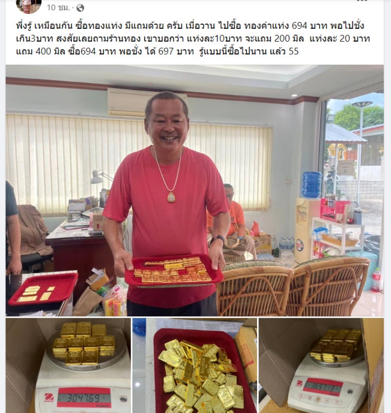 พึ่งรู้ เหมือนกัน ซื้อทองแท่ง มีแถมด้วย ครับ เมื่อวาน ไปซื้อ ทองคำแท่ง 694 บาท พอไปชั่งเกิน3บาท สงสัยเลยถามร้านทอง เขาบอกว่า แท่งละ 10 บาท จะแถม 200 มิล แท่งละ 20 บาทแถม 400 มิล ซื้อ 694 บาท พอชั่ง ได้ 697 บาท รู้แบบนี้ซื้อไปนาน แล้ว 55