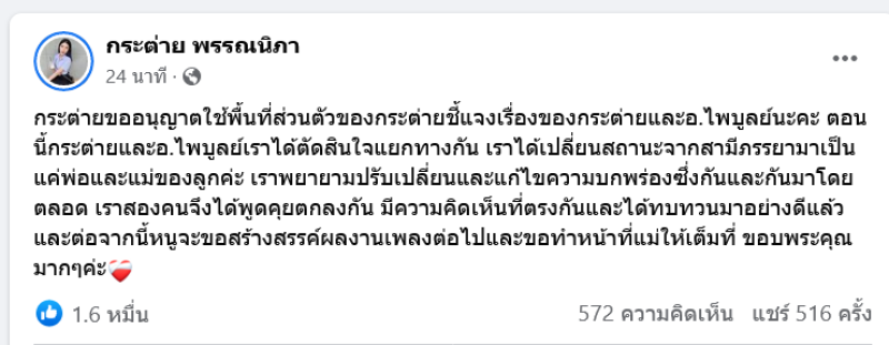 กระต่ายขออนุญาตใช้พื้นที่ส่วนตัวของกระต่ายชี้แจงเรื่องของกระต่ายและอ.ไพบูลย์นะคะ ตอนนี้กระต่ายและอ.ไพบูลย์เราได้ตัดสินใจแยกทางกัน เราได้เปลี่ยนสถานะจากสามีภรรยามาเป็นแค่พ่อและแม่ของลูกค่ะ เราพยายามปรับเปลี่ยนและแก้ไขความบกพร่องซึ่งกันและกันมาโดยตลอด เราสองคนจึงได้พูดคุยตกลงกัน มีความคิดเห็นที่ตรงกันและได้ทบทวนมาอย่างดีแล้วและต่อจากนี้หนูจะขอสร้างสรรค์ผลงานเพลงต่อไปและขอทำหน้าที่แม่ให้เต็มที่ ขอบพระคุณมากๆค่ะ