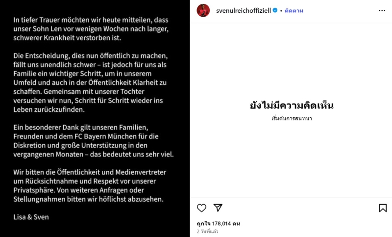 จากสื่อต่างประเทศ ได้รายงานว่า สเวน อุลไรช์ นายทวารจอมหนึบของ บาเยิร์น มิวนิก แชมป์บุนเดสลีกา เยอรมนี เปิดเผยข่าวเศร้า หลังสูญเสีย เลน บุตรชายวัย 6 ขวบ ไปแบบไม่มีวันกลับ