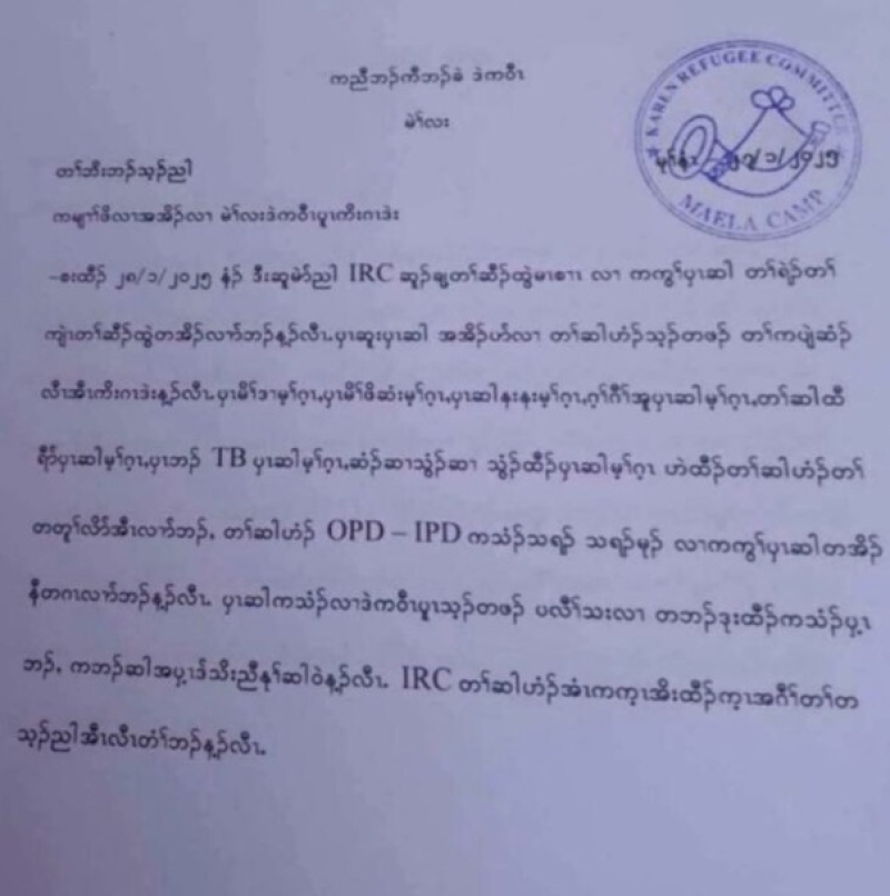 คณะกรรมการผู้ลี้ภัยกะเหรี่ยง ค่ายแม่หละ อ.ท่าสองยาง จ.ตาก ออกประกาศแจ้งว่าการสนับสนุนด้านสาธารณสุขของคณะกรรมการกู้ภัยระหว่างประเทศ (International Rescue Committee -IRC) เกี่ยวกับการดูแลผู้ป่วยจะไม่มีอีกต่อไป นับตั้งแต่วันที่ 28 ม.ค. เนื่องจากถูกระงับความช่วยเหลือจากรัฐบาลสหรัฐฯ ภายหลังจากการขึ้นดำรงตำแหน่งสมัยที่ 2 ของประธานาธิบดีโดนัลด์ ทรัมป์ รอบสอง