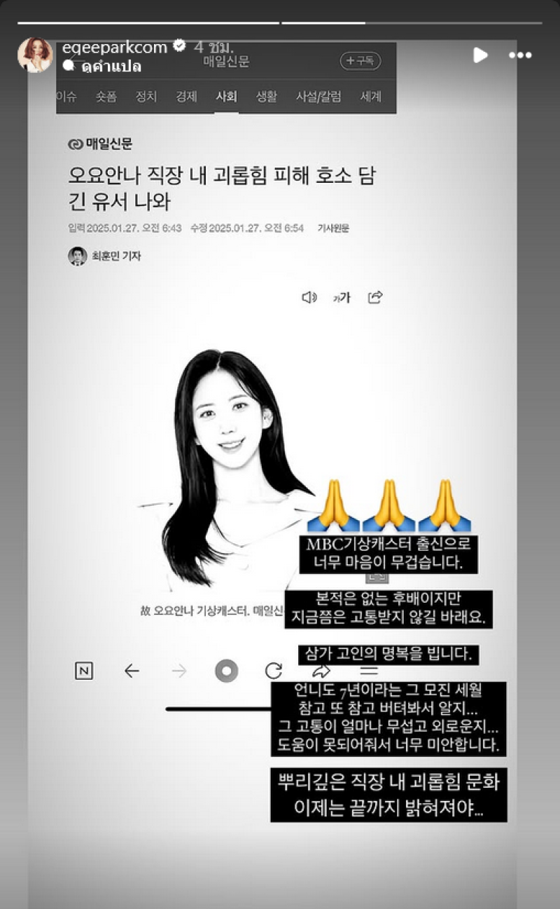 เรื่องนี้สร้างความหนักใจให้กับฉันมากในฐานะอดีตผู้พยากรณ์อากาศของ MBC ฉันไม่เคยได้พบกับ รุ่นน้องของฉันเลย แต่ฉันหวังว่าเธอจะไม่เจ็บปวดอีกต่อไป ขอให้เธอได้ไปสู่สุคติ ฉันเองก็เคยเจอกับประสบการณ์อันน่าหนักใจมาตลอด 7 ปี ฉันรู้ว่ามันน่ากลัวแค่ไหน มันเหงาและเจ็บปวดแค่ไหน ฉันขอโทษจริงๆ ที่ฉันช่วยคุณไม่ได้เลย และวัฒนธรรมการกลั่นแกล้งที่หยั่งรากลึกในที่ทำงานจำเป็นต้องยุติลงด้วยการสืบสวนอย่างละเอียดถี่ถ้วน