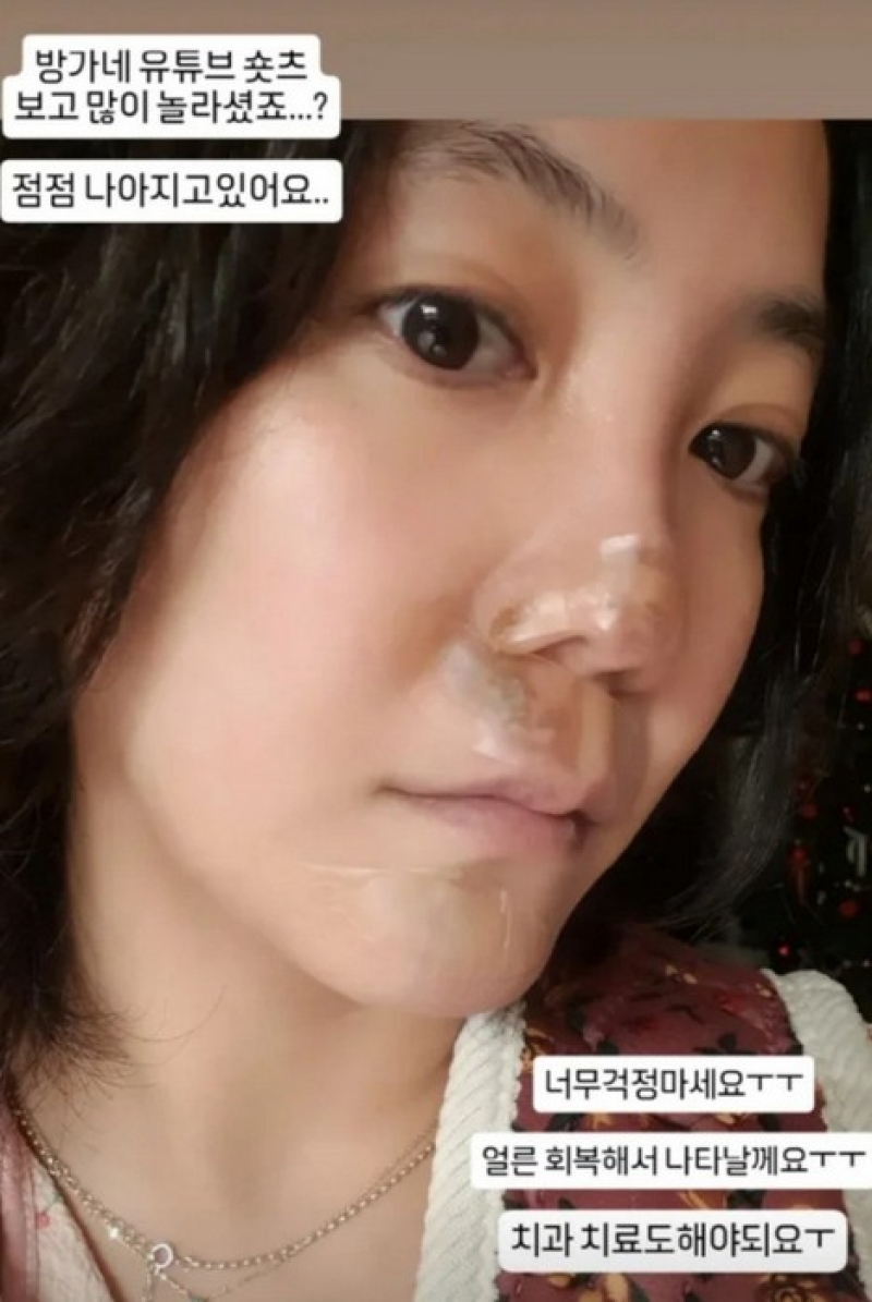 ฉันควรบอกไปว่าโดนต่อยดีไหม แต่ก็ยอมรับว่าเจ็บจริงและเผยว่า คงไม่ได้ไลฟ์สดไปอีกสัก ล่าสุดเมื่อวันที่ 3 ก.พ.ที่ผ่านมา โก อึนอาอัปเดตอาการว่า ดีขึ้นมากแล้ว ขอบคุณที่เป็นห่วง พร้อมยืนยันว่ารอยแดงจะค่อยๆ หายไปพัก