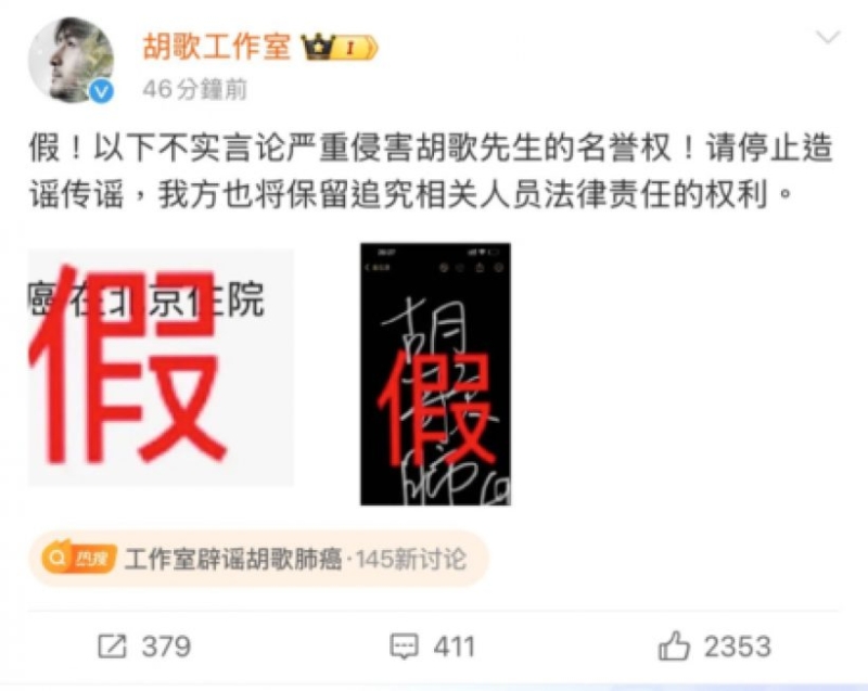 จากกรณี หูเกอ นักแสดงชื่อดังจากจีนแผ่นดินใหญ่ เพิ่งให้สัมภาษณ์กับนิตยสารแฟชั่นและได้พูดคุยเกี่ยวกับประเด็นเรื่อง "ความตาย" แต่ไม่นานหลังจากนั้น กลับมีข่าวลือแพร่สะพัดทางออนไลน์ว่าเขา ป่วยเป็นมะเร็งปอด และได้เข้ารับการรักษาในโรงพยาบาลแห่งหนึ่งในกรุงปักกิ่งแล้ว