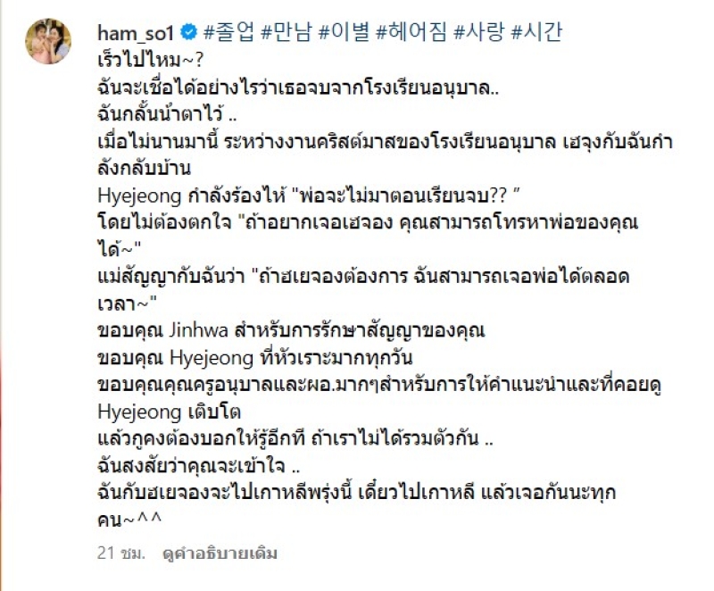 โดยโพสต์รูปงานรับปริญญาของฮเยจองหลังอาหารกลางวัน ทั้งนี้ ฮัมโซวอน ยังได้เขียนข้อความถึงลูกสาวของเธออีกด้วยว่า ฉันไม่อยากจะเชื่อเลยว่าเธอจะ เรียนจบชั้นอนุบาลแล้ว ฉันพยายามกลั้นน้ําตาเอาไว้ไม่อยู่ ย้อนกลับไปในเดือนธันวาคม หลังจาก งานคริสต์มาสของโรงเรียนอนุบาล ฉันกําลังเดินกลับบ้านกับฮเยจอง แล้วเธอก็ถามขึ้นมาว่า พ่อจะ มางานรับปริญญาของฉันไหม ฉันตอบโดยไม่ลังเลว่า ถ้าฮเยจองอยากพบเขา พ่อก็จะมาแน่นอน! ฉันสัญญากับเธอว่า เมื่อไหร่ก็ตามที่ฮเยจองต้องการ เธอจะสามารถพบพ่อได้ทุกเมื่อ' ฉันรู้สึกขอบ คุณจินหัวที่รักษาสัญญานั้นได้" ฮัมโซวอน ยังชี้แจงด้วยว่าเธอไม่คิดจะรีเทิร์นกลับมาคืนดีกับอดีตสามีได้ เธอกล่าวว่า