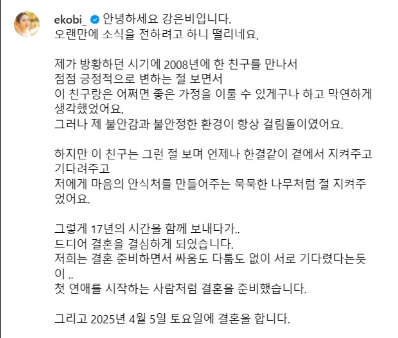 จากสื่อต่างประเทศ ได้รายงานว่า วันที่ 6 มี.ค. Kang Eun-bi ได้เขียนข้อความผ่านสื่อส่วนตัวของเธอว่า "ในปี 2008 ขณะที่ฉัน กําลังท่องเที่ยว ฉันได้พบกับเพื่อนคนหนึ่ง และเมื่อฉันเห็นเขาค่อยๆ เปลี่ยนแปลงไปในทาง ที่ดีขึ้น ฉันคิดไปเองว่าบางทีฉันอาจสร้างครอบครัวที่ดีกับเขาได้ อย่างไรก็ตาม ความวิตก กังวลและสภาพแวดล้อมที่ไม่มั่นคงของฉันเป็นอุปสรรคเสมอมา" "แต่เพื่อนคนนี้ก็คอยอยู่ เคียงข้างฉันเสมอ คอยดูแลฉัน คอยรอฉัน และสร้างสถานที่แห่งความสงบในใจของฉัน เหมือนกับต้นไม้ที่เงียบงันที่คอยปกป้องฉัน" "หลังจากใช้ชีวิตคู่กันมา 17 ปี ในที่สุดเราก็ ตัดสินใจที่จะแต่งงานกัน"