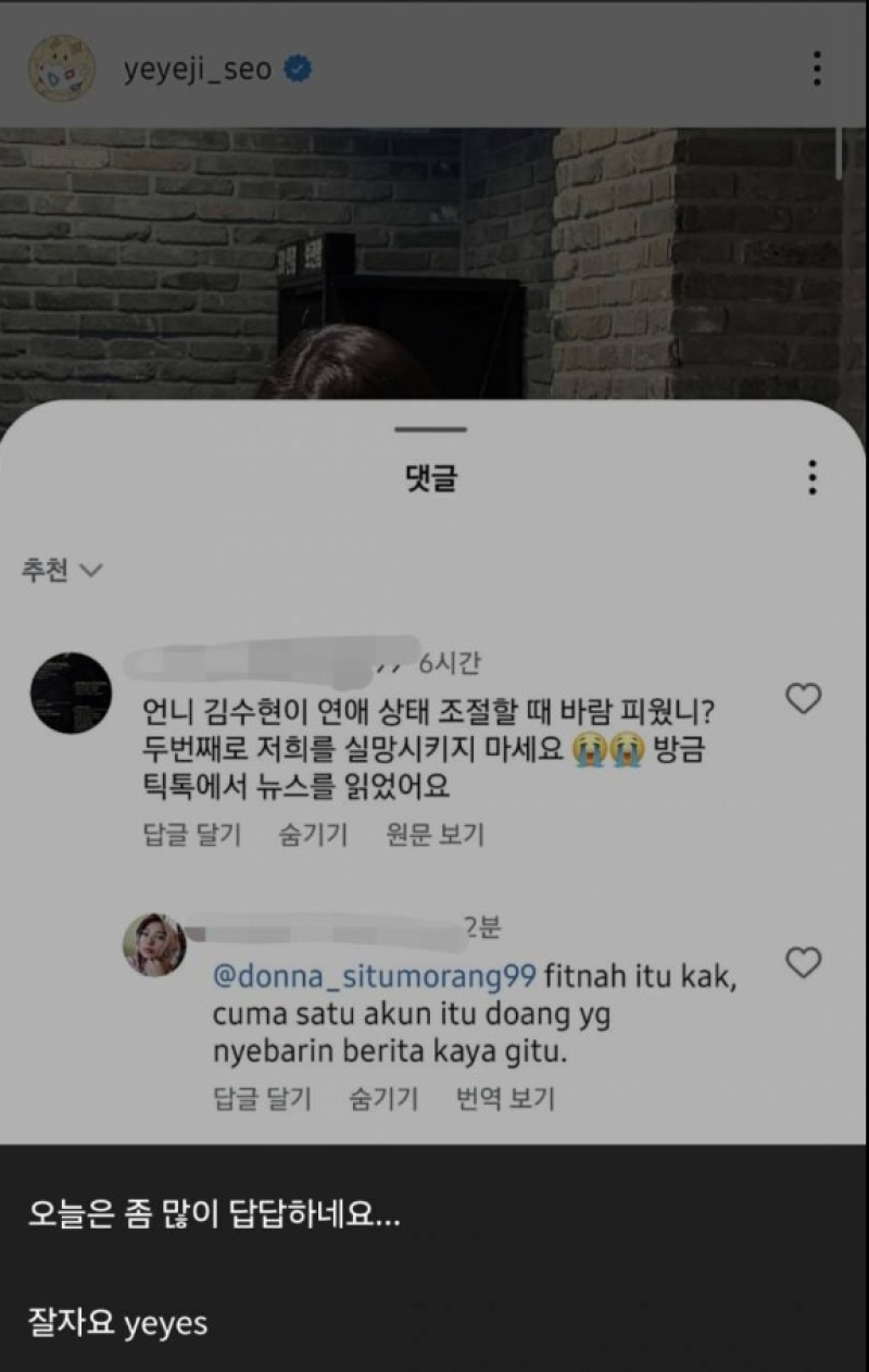 โดยเธอยืนยันว่าไม่มีความสัมพันธ์ส่วนตัวกับคิมซูฮยอนหรือพี่ชายของเขา ซอเยจีได้เขียน ข้อความถึงแฟน ๆ ว่าเธอรู้สึกเหนื่อยล้า และเศร้าใจจากข่าวลือดังกล่าว และขอให้หยุดเผย แพร่ข้อมูลที่ไม่เป็นความจริง "ฉันไม่รู้ว่าทําไมฉันต้องอธิบายเรื่องนี้ด้วย"