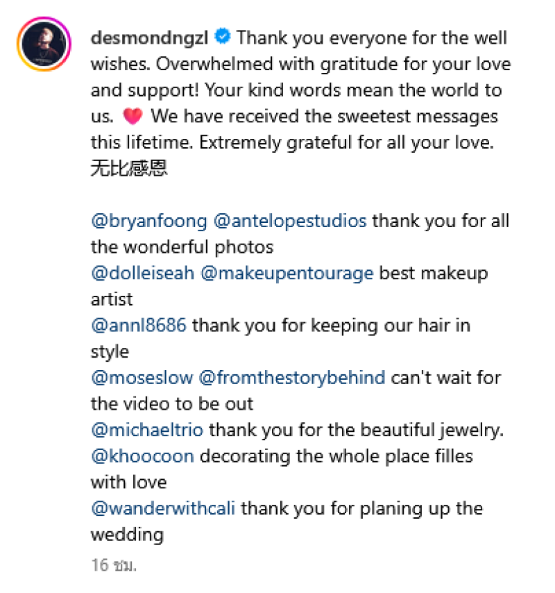 ทั้งนี้บ่าวสาวป้ายแดง ยังได้โพสต์ภาพบรรยากาศเต็มไปด้วยความสุขกับข้อความ desmondngzl ว่า Thank you everyone for the well wishes. Overwhelmed with gratitude for your love and support! Your kind words mean the world to us. We have received the sweetest messages this lifetime. Extremely grateful for all your love