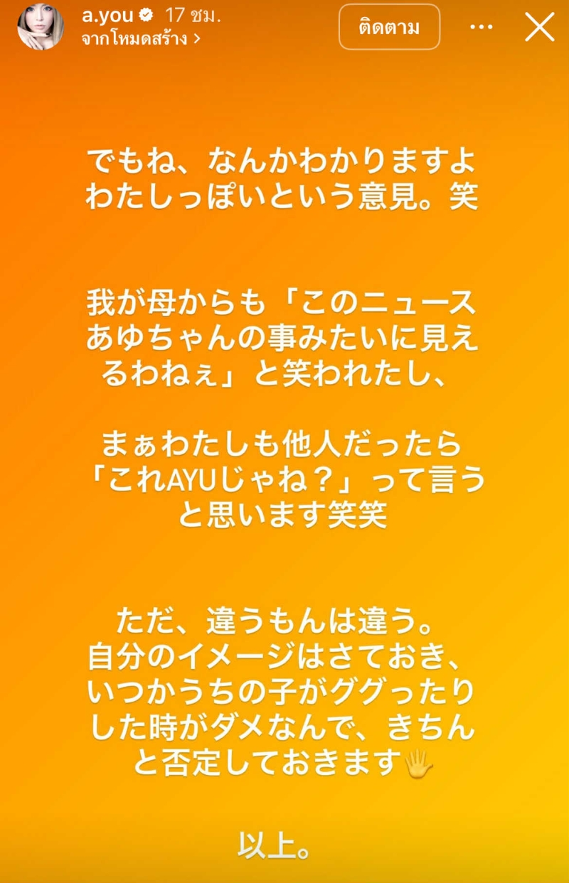โดย อายูมิ ยังทิ้งท้ายอย่างจริงใจว่า ถึงจะเป็นเรื่องขำ แต่ถ้าลูกฉันโตไปแล้วเสิร์ชเจอข่าวนี้ มันอาจกระทบถึงเขาได้ ก็เลยอยากออกมาปฏิเสธให้ชัดเจนไว้ก่อนนะคะ จบ