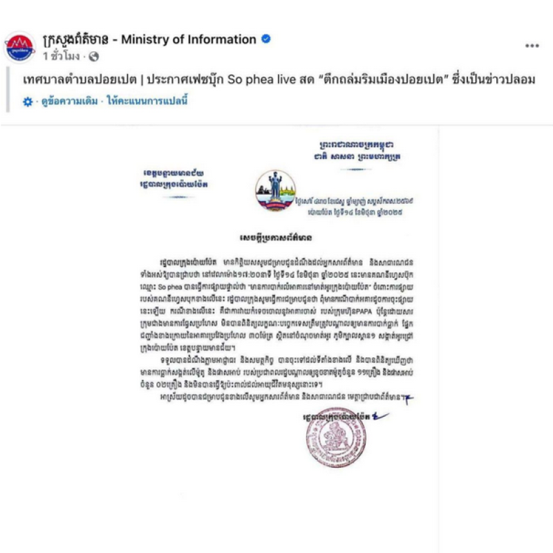 ล่าสุด เทศบาลนครปอยเปต ออกแถลงการณ์ระบุว่า เหตุอาคารถล่มบริเวณปากแม่น้ำปอยเปต ไม่เป็นความจริง โดยกรณีดังกล่าวเป็นการรื้อถอนอาคารเก่า แต่เนื่องจากความประมาทเลินเล่อของทีมงานก่อสร้างและไม่ได้ตรวจสอบคุณสมบัติทางเทคนิคอย่างเหมาะสม ส่งผลให้ผนังด้านหลังของอาคารยาวประมาณ 300 เมตร พังถล่มลงมา จากการตรวจสอบพบว่า มีรถได้รับความเสียหาย 11 คัน และรถจักรยานยนต์ อีก 2 คัน แต่ไม่มีผู้ใดได้รับบาดเจ็บ