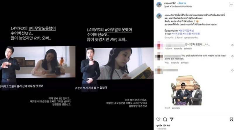 “ฉัน ซงซอบิน ผู้จัดการของนักแสดง อีซอยี ค่ะ พี่สาวผู้เปล่งประกาย งดงาม น่ารัก และแสนดีของเรา ได้กลายเป็นดวงดาวบนฟากฟ้า เมื่อวันที่ 20 มิถุนายน ปี 2025 จึงขอแจ้งข่าวเศร้าให้ทุกท่านได้รับทราบ แต่ขอให้ช่วยภาวนาให้พี่สาวของเรา ได้เดินทางไปยังสถานที่ที่สวยงามและสงบสุขด้วยนะคะ หากท่านใดต้องการทราบข้อมูลเพิ่มเติม สามารถติดต่อได้ทาง @songsong_seo ขอแจ้งให้ทราบในนามของคุณพ่อและคุณแม่ของเธอ”