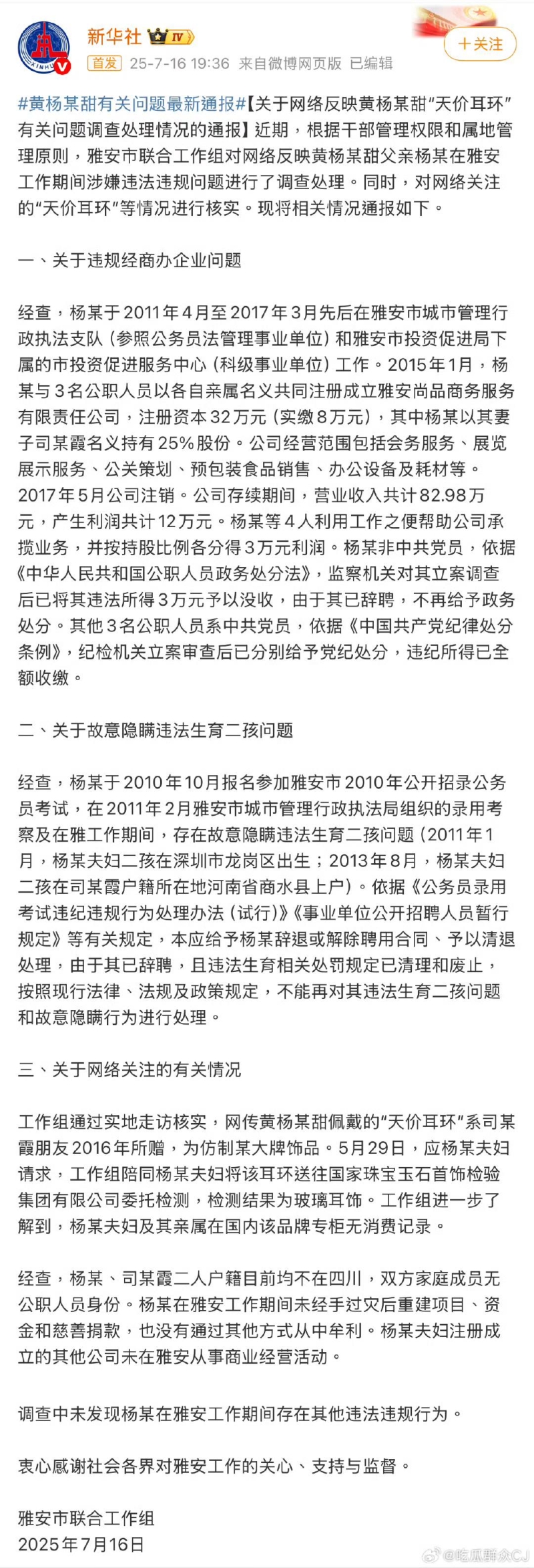 จากข่าวสารบันเทิงจีน ได้รายงานว่า สำนักซินหัวของจีนเปิดเผยรายงานการสอบสวนครอบครัวของน้องหวงหยางเตี้ยนเถียนแล้ว ผลการสอบสวนนี้ถือว่าเป็นทางการและเป็นที่สิ้นสุด ตามประกาศอย่างเป็นทางการที่เผยแพร่โดยคณะทำงานร่วมเมืองหยาอัน เมื่อวันที่ 16 กรกฎาคม 2568 ผลการสอบสวนเกี่ยวกับปัญหาของหวงหยางเตี้ยนเถียน และพ่อของเธอ หยางมู่ มีดังนี้ (ในบทความเรียกว่า "หวงหยางมู่เถียน")