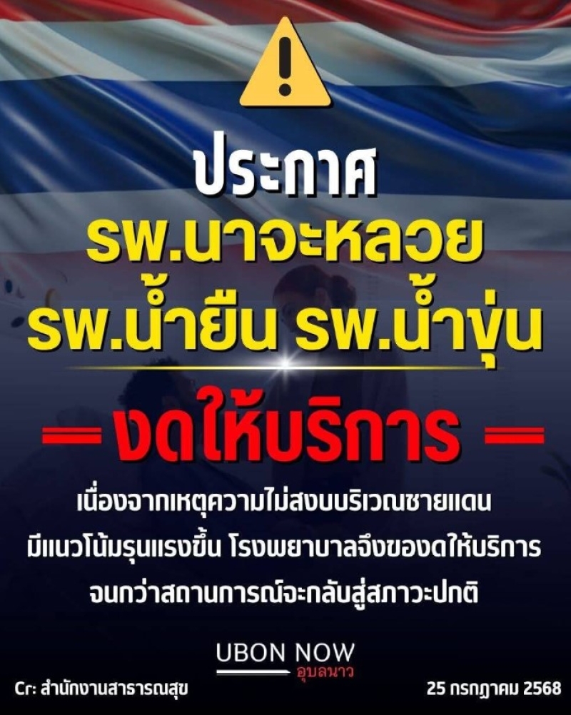 วันที่ 25 กรกฎาคม 68 กระทรวงสาธารณสุขแจ้งว่า 3 โรงพยาบาลในจ.บุลราชธานี ได้แก่ รพ.นาจะหลวย รพ.น้ำยืน และ รพ.น้ำขุ่น งดให้บริการ เนื่องจากเหตุการณ์ไม่สงบบริเวณชายแดน ที่มีแนวโน้มรุนแรงขึ้น โรงพยาบาลจึงของดให้การบริการ จนกว่าสถานการณ์จะกลับสู่สภาวะปกติ