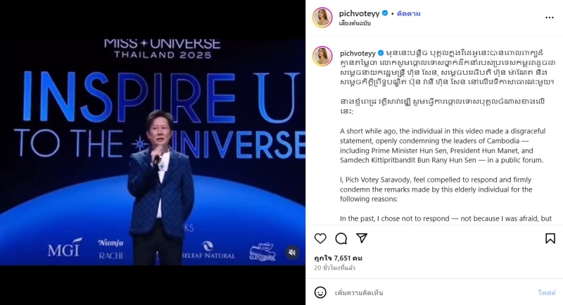 ซึ่งเธอได้โพสต์ว่า มีบุคคลสำคัญในวงการนางงามไทยได้กล่าวถ้อยคำอันน่าอับอาย โดยประณามผู้นำกัมพูชาอย่างเปิดเผย ซึ่งรวมถึงนายกรัฐมนตรีฮุนเซน ประธานาธิบดีฮุน มาเนต และสมเด็จกิตติพงศ์ บุนรานี ฮุนเซน ในเวทีสาธารณะ