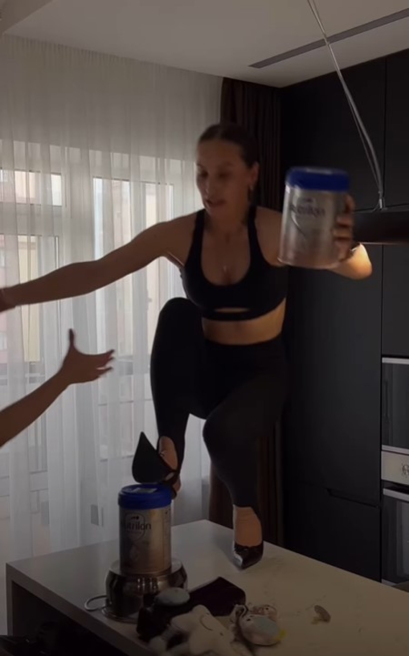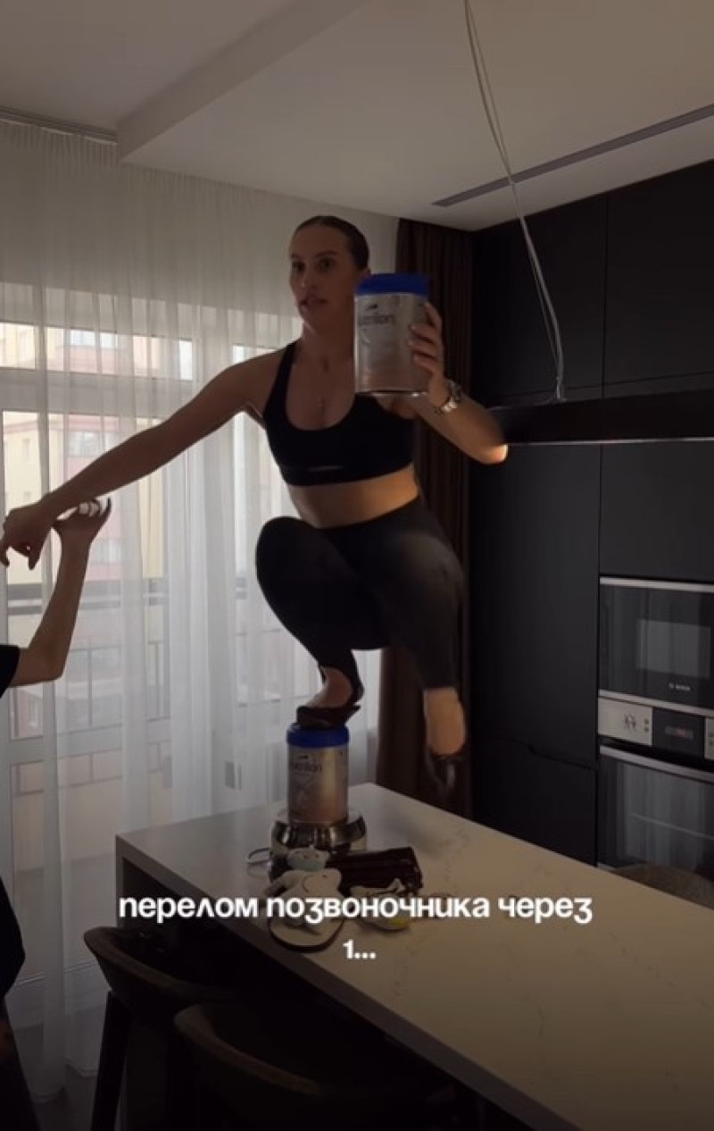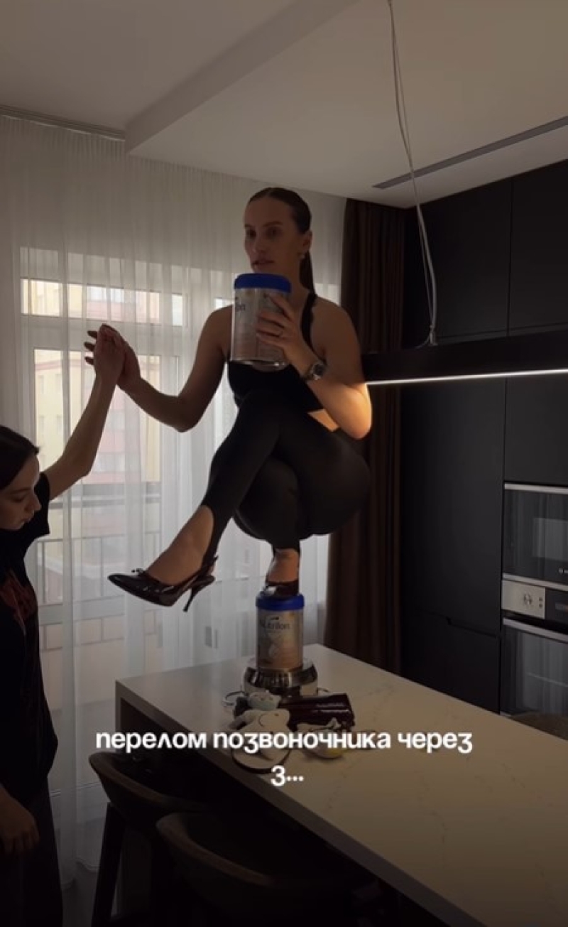 มาเรียนา บารุตคินา วัย 32 ปี ลองทำชาเลนจ์นี้บนเคาน์เตอร์ครัว โดยทรงตัวบนขวดอาหารเด็กที่วางซ้อนกันบนหม้อ ขณะสวมรองเท้าส้นเข็ม ชาเลนจ์นี้ได้รับแรงบันดาลใจจากท่าโพสอันโด่งดังของนิกกี้ มินาจในมิวสิกวิดีโอเพลง High School