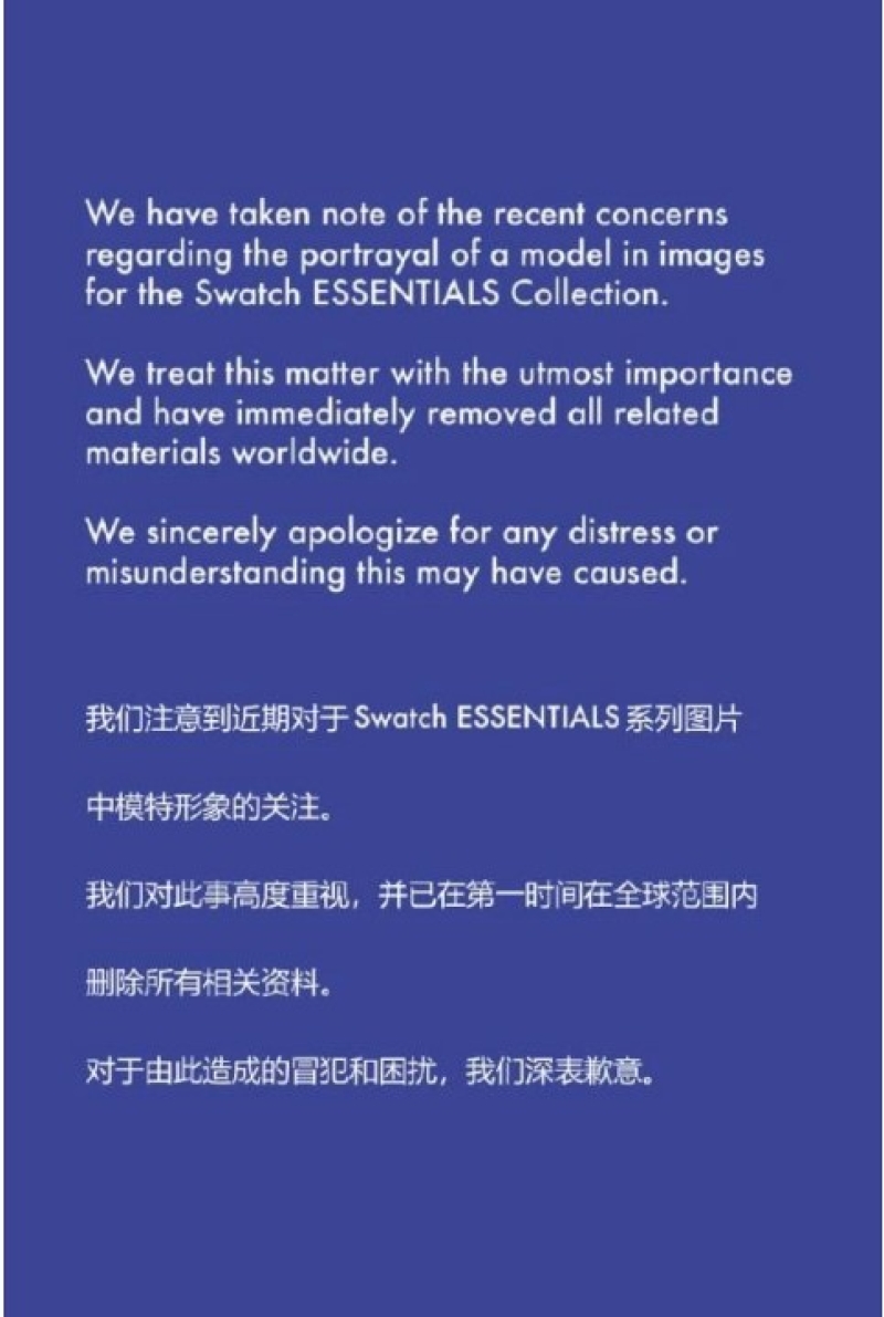 จากสื่อต่างประเทศ ได้รายงานว่า สวอทช์ (Swatch) ผู้ผลิตนาฬิกาสัญชาติสวิส ได้ออกมาขอโทษและยกเลิกโฆษณาที่มีนายแบบที่กำลังดึงหางตาขึ้น หลังจากภาพโฆษณาดังกล่าว ก่อให้เกิดกระแสวิพากษ์วิจารณ์ในหมู่ผู้ใช้โซเชียลมีเดียชาวจีน