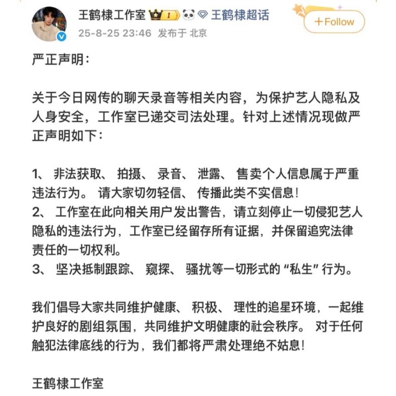 จากสื่อต่างประเทศ ได้รายงานว่า วันที่ 26 สิงหาคม 2025 ที่ผ่านมา ทาง สตูดิโอของหวังเฮ่อตี้ ออกแถลงการณ์อย่างเป็นทางการ ระบุว่า ประกาศอย่างเป็นทางการ เกี่ยวกับการบันทึกการแชทและเนื้อหาอื่นๆที่เกี่ยวข้องที่โพสต์บนอินเทอร์เน็ตในวันนี้เพื่อปกป้องความเป็นส่วนตัวและความปลอดภัยส่วนบุคคลของศิลปินสตูดิโอได้ส่งการพิจารณาคดีเพื่อตอบสนองต่อสถานการณ์ข้างต้นเราได้แถลง ดังนี้