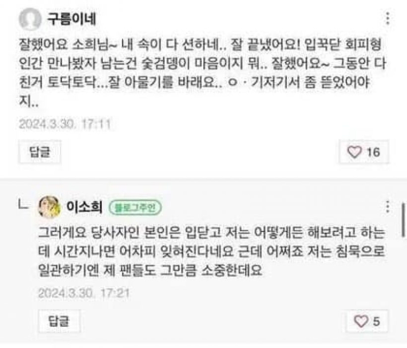 ด้านฮันโซฮีก็ได้ตอบกลับไปว่า คุณพูดถูก คนที่เกี่ยวข้องเอาแต่เงียบเฉย ขณะที่ฉันพยายามทำทุกอย่างที่ทำได้ เมื่อเวลาผ่านไปมันจะถูกลืมนั่นคือสิ่งที่เขาพูด แต่จะทำอย่างไรได้ แฟนๆ ของฉันมีค่าสำหรับฉันมากเหลือเกิน ดังนั้นฉันจึงไม่สามารถนั่งดูเฉยๆได้