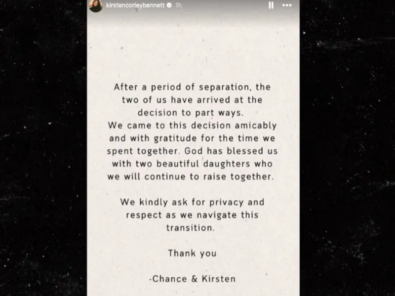 จาก สำนักข่าวต่างประเทศ ได้รายงานว่า ประกาศหย่ากันอย่างเป็นทางการเเล้วสำหรับคู่ของเเร็ปเปอร์หนุ่ม Chance the Rapper และภรรยาของเขา Kirsten Corley ทั้งคู่ได้ออกมาเขียนข้อความผ่านอินสตราแกรมสตอรี่ส่วนตัวว่า
