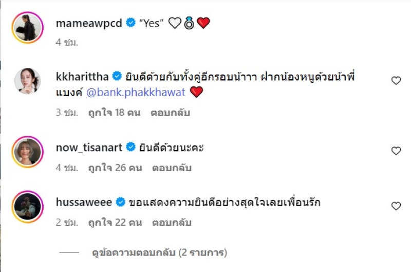 โดยสาว มะเหมี่ยว ได้โพสต์ทั้งภาพและคลิปโมเมนต์ พร้อมระบุแคปชั่นสั้นๆว่า Yes ท่ามกลางแฟนด้วยเพื่อนๆในวงการต่างเข้ามาแสดงความยินดีจำนวนมาก
