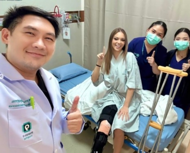 เธอโพสต์ว่า เมื่อวานนี้ระหว่างการซ้อม ฉันล้มจนได้รับบาดเจ็บที่หัวเข่า ต้องขอบคุณกาช่วยเหลือและ รสนับสนุนขององค์กร มิสแกรนด์ @missgrandinternational ตอนนี้ฉันอยู่ภายใต้การดูแลของแพทย์ผู้เชี่ยวชาญ และกำลังมุ่งมั่นกับการฟื้นตัวอย่างเต็มที่