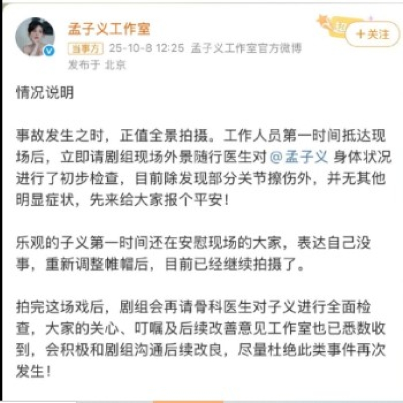 ทางสตูดิโอ ออกมาโพสต์แจ้งข่าวว่า จากอุบัติเหตุเกิดขึ้น ทีมงานได้ขอให้แพทย์ประจำสถานที่ทำการตรวจร่างกายเบื้องต้นทันที นอกจากรอยถลอกที่ข้อต่อแล้ว ยังไม่มีอาการอื่นๆ ที่ชัดเจน เพียงเพื่อให้ทุกคนทราบว่าเธอปลอดภัย หลังจากถ่ายทำฉากนี้เสร็จ ทีมงานจะให้ศัลยแพทย์กระดูกและข้อ ทำการตรวจเมิ่งจื่ออี้ อย่างละเอียดอีกที