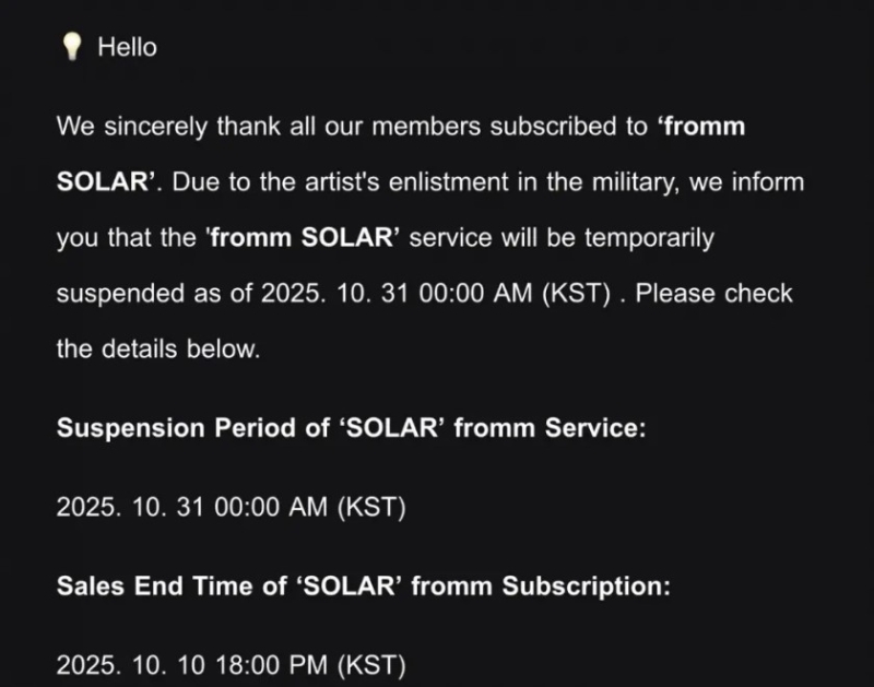 ข้อความประกาศแพลตฟอร์ม Fromm ดังนี้ สวัสดีค่ะ พวกเราขอขอบคุณสมาชิกทุกท่านที่ได้สมัครใช้บริการ ‘fromm SOLAR’ มาโดยตลอด เนื่องจากศิลปินจะเข้ารับการเกณฑ์ทหาร พวกเราจึงขอแจ้งให้ทราบว่า บริการ ‘fromm SOLAR’ จะถูกระงับชั่วคราวตั้งแต่วันที่ 31 ตุลาคม 2025 เวลา 00:00 น. (ตามเวลาเกาหลีใต้) เป็นต้นไป โปรดตรวจสอบรายละเอียดเพิ่มเติมด้านล่างนี้