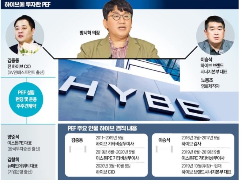 ขณะเดียวกัน แหล่งข่าววงในวาณิชธนกิจชี้ว่าคิมจุงดงเป็นบุคคลสำคัญในแผนการแสวงหากำไรพันล้านดอลลาร์ ในปี 2019 คิมจุงดง บังชีฮยอก และคนอื่นๆ ได้บีบบังคับให้ผู้ถือหุ้นของ Big Hit Entertainment ขายหุ้นของพวกเขา โดยอ้างว่าบริษัทไม่มีแผนที่จะเข้าจดทะเบียนในตลาดหลักทรัพย์ บุคคลเหล่านี้สามารถได้หุ้นจำนวนมากผ่านกองทุนไพรเวทอิควิตี้ที่จัดตั้งโดยคิมจุงดงและคนอื่นๆ ต่อมาเมื่อ HYBE เข้าจดทะเบียนเป็นบริษัทมหาชนในปี 2020 พวกเขาได้ขายหุ้นของ HYBE ไปประมาณ 9.16% ส่งผลให้ได้กำไรรวม 360,000 ล้านวอน (ประมาณ 250 ล้านดอลลาร์สหรัฐ) กำไรทั้งหมดนั้น คิมจุงดงเองได้กำไรไปประมาณ 100,000 ล้านวอน (ประมาณ 70 ล้านดอลลาร์สหรัฐ) ก่อนหน้านี้มีรายงานว่าบังชีฮยอกได้กำไรจากแผนการนี้ไปประมาณ 190,000 ล้านวอน (ประมาณ 132 ล้านดอลลาร์สหรัฐ)