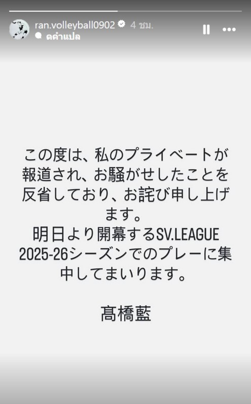 โดย รัน ทากาฮาชิ โพสต์ข้อความผ่านทาง อินสตาแกรมส่วนตัว @ran.volleyball0902 ที่มียอดผู้ติดตามมากกว่า 2.7 ล้านคน ว่า "ผมขอแสดงความเสียใจและขอโทษอย่างสุดซึ้งที่เหตุการณ์เกี่ยวกับเรื่องส่วนตัวของผม ที่ได้ถูกสื่อนำไปรายงานจนเกิดความวุ่นวายจากนี้ไป ผมจะมุ่งมั่นตั้งใจทุ่มเทกับการเล่นในฤดูกาล SV.LEAGUE 2025–26 ที่จะเปิดฉากในวันพรุ่งนี้อย่างเต็มที่ครับ"
