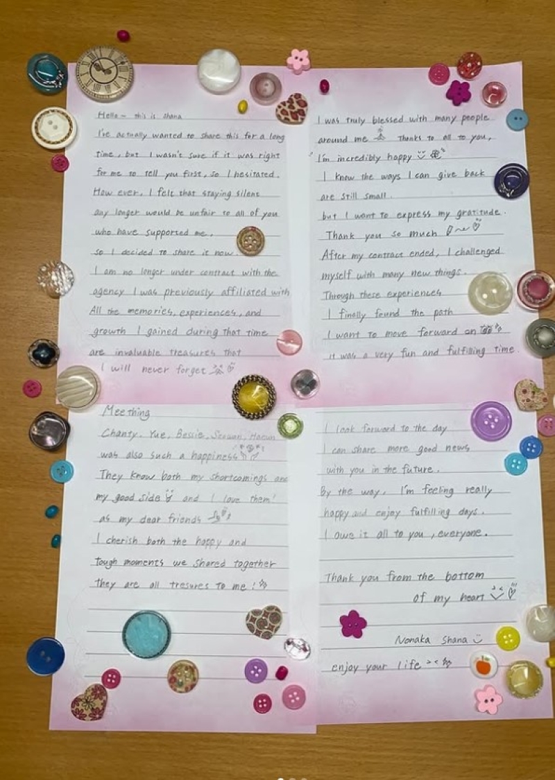 เมื่อวันที่ 26 ตุลาคม 2025 ที่ผ่านมา ชานะ ได้โพสต์ข้อความบนอินสตาแกรม ประกาศว่าเธอออกจาก MLD Entertainment มาหลายเดือนแล้ว ในโพสต์ที่เขียนทั้งภาษาญี่ปุ่นและภาษาอังกฤษ เธอเปิดใจว่า ที่ผ่านมาเธอลังเลที่จะบอกข่าวนี้ แต่ไม่อยากปิดบังแฟน ๆ อีกต่อไป “ตอนนี้ฉันไม่ได้อยู่ภายใต้สัญญากับค่ายเดิมแล้วค่ะ ความทรงจำ ประสบการณ์ และการเติบโตที่ฉันได้รับในช่วงเวลานั้น ล้วนเป็นสิ่งล้ำค่าที่จะอยู่กับฉันตลอดไป”