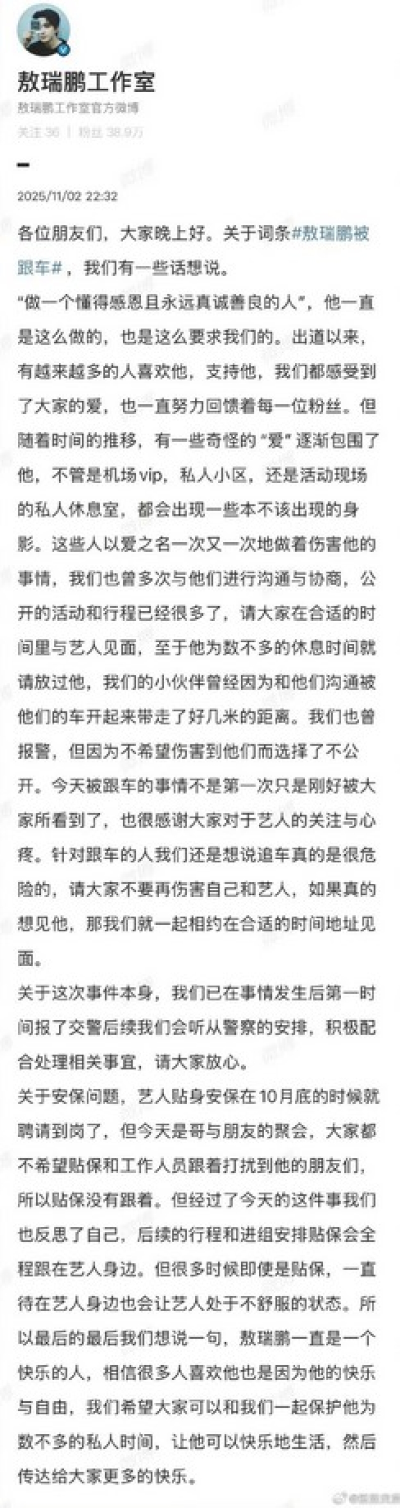 จากสื่อต่างประเทศ ได้รายงานว่า เมื่อวันที่ 2 พ.ย. 2025 ที่ผ่านมา เกิดเหตุการณ์สุดอันตรายขึ้นกับ อ๋าวรุ่ยเผิง (Ao Ruipeng) ขณะที่เขากำลังสังสรรค์กับเพื่อนๆ ในเซี่ยงไฮ้ โดยมี รถของ "ซาแซง" (แฟนคลับที่คุกคามความเป็นส่วนตัว) จำนวน 2 คัน ได้ขับรถไล่ตามคุณอ๋าวรุ่ยเผิงด้วยความเร็วสูง ซาแซงพยายาม เบียด ตัดหน้า บีบให้หยุดรถ และ เปิดไฟสูงใส่ ตลอดระยะทางเกือบ 20 กิโลเมตร ซึ่งเป็นพฤติกรรมที่เสี่ยงต่อการเกิดอุบัติเหตุร้ายแรง และเป็นภัยต่อความปลอดภัยสาธารณะอย่างยิ่ง