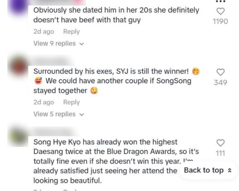 จากสื่อต่างประเทศ ได้รายงานว่า งานประกาศรางวัล Blue Dragon Film Awards ปีนี้บอกเลยว่า "ไฟลุก" เพราะนอกจากจะรวมตัวท็อปไว้แน่นงานแล้ว ไฮไลท์ที่ทำเอาโซเชียลแตกตื่นก็คือการโคจรมาเจอกันของ ซงฮเยคโย (Song Hye Kyo) และอดีตคนรักอย่าง ฮยอนบิน (Hyun Bin) นี่แหละ งานนี้ชีมาในลุคเดรสสีชมพูเบบี้พิ้งค์ (Baby Pink) คือสวยหวาน สวยแพง สวยแบบตะโกนว่า "นางพญา" ออร่ากระแทกตาแตกมาก!