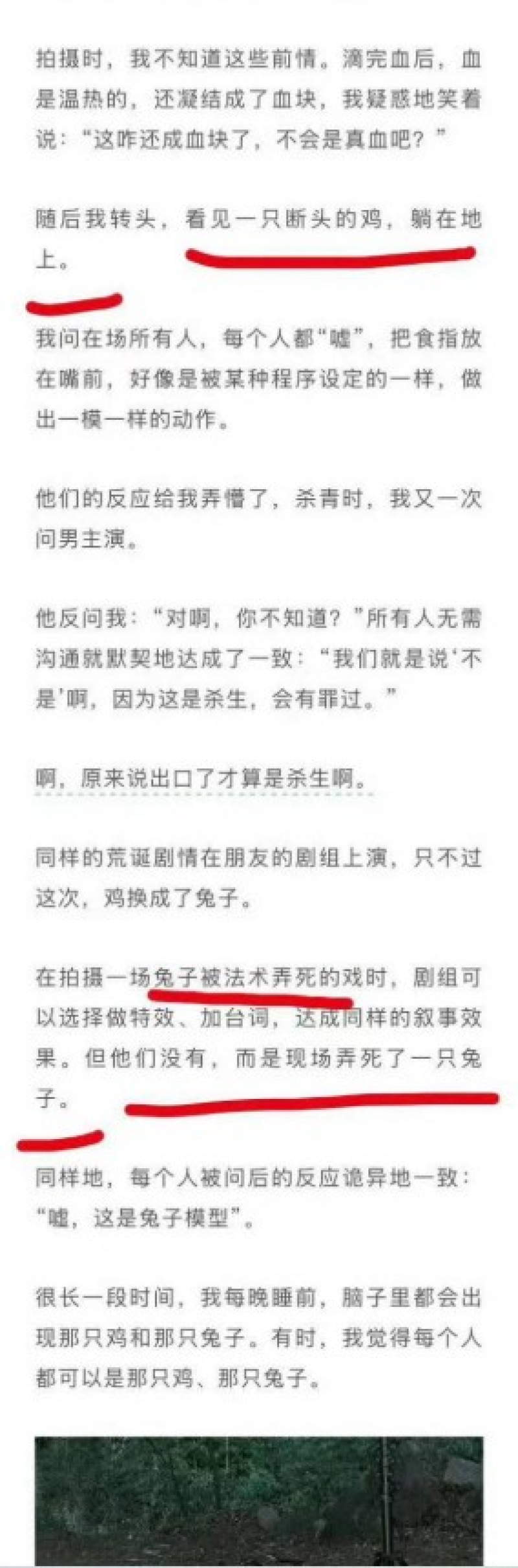 - แทนที่จะใช้ CG หรือโมเดล ทีมงานเลือก ฆ่ากระต่ายจริง แล้ว อ้างหลังถ่ายทําว่า "เป็นพร็อพ" ทั้งหมดนี้เกิดขึ้นเพื่อ "ลดต้นทุน" ทั้งที่การใช้พร็อพหรือ CG เพิ่มงบเพียงหลักหมื่นหยวน แต่หลาย กองกลับเลือกจ่ายแค่ "หลักสิบ