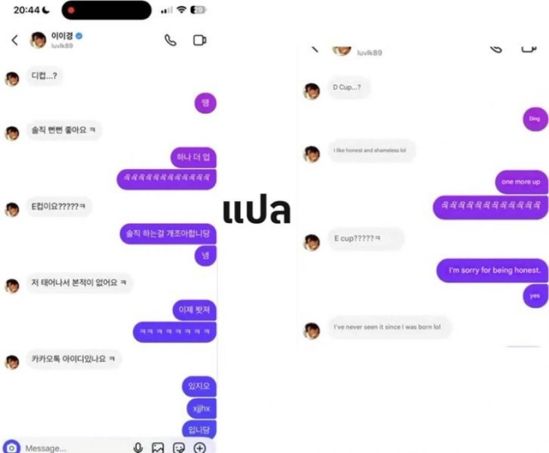 ยังมีใครคิดว่านี่คือ AI อยู่ไหม? ถ้านี่เป็นของจริง แชต KakaoTalk ที่เหลือก็น่าจะเป็นของจริงเหมือนกัน ฉันก็อาย แต่ไม่มีทางเลือก จากคลิปดังกล่าวเผยให้เห็นว่า การสนทนาเริ่มต้นเมื่อวันที่ 26 มกราคม 2024 โดยฝ่ายหญิงเป็นคนทักไปก่อน พร้อมระบุว่าเธออายุน้อยกว่าอีอีคยอง 10 ปี