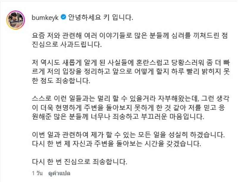 แถลงการณ์ส่วนตัวจากคีย์ ด้านคีย์ได้ออกแถลงการณ์ด้วยตัวเอง โดยกล่าวว่า “สวัสดีครับ นี่คือคีย์ ผมขอโทษอย่างจริงใจที่ทำให้หลายคนต้องกังวล จากประเด็นต่าง ๆ ที่เกี่ยวข้องกับผมในช่วงนี้ ผมเองก็รู้สึกสับสนและตกใจกับข้อเท็จจริงที่เพิ่งถูกเปิดเผย และขออภัยที่ไม่สามารถจัดการความคิดและชี้แจงทิศทางในอนาคตได้อย่างรวดเร็ว