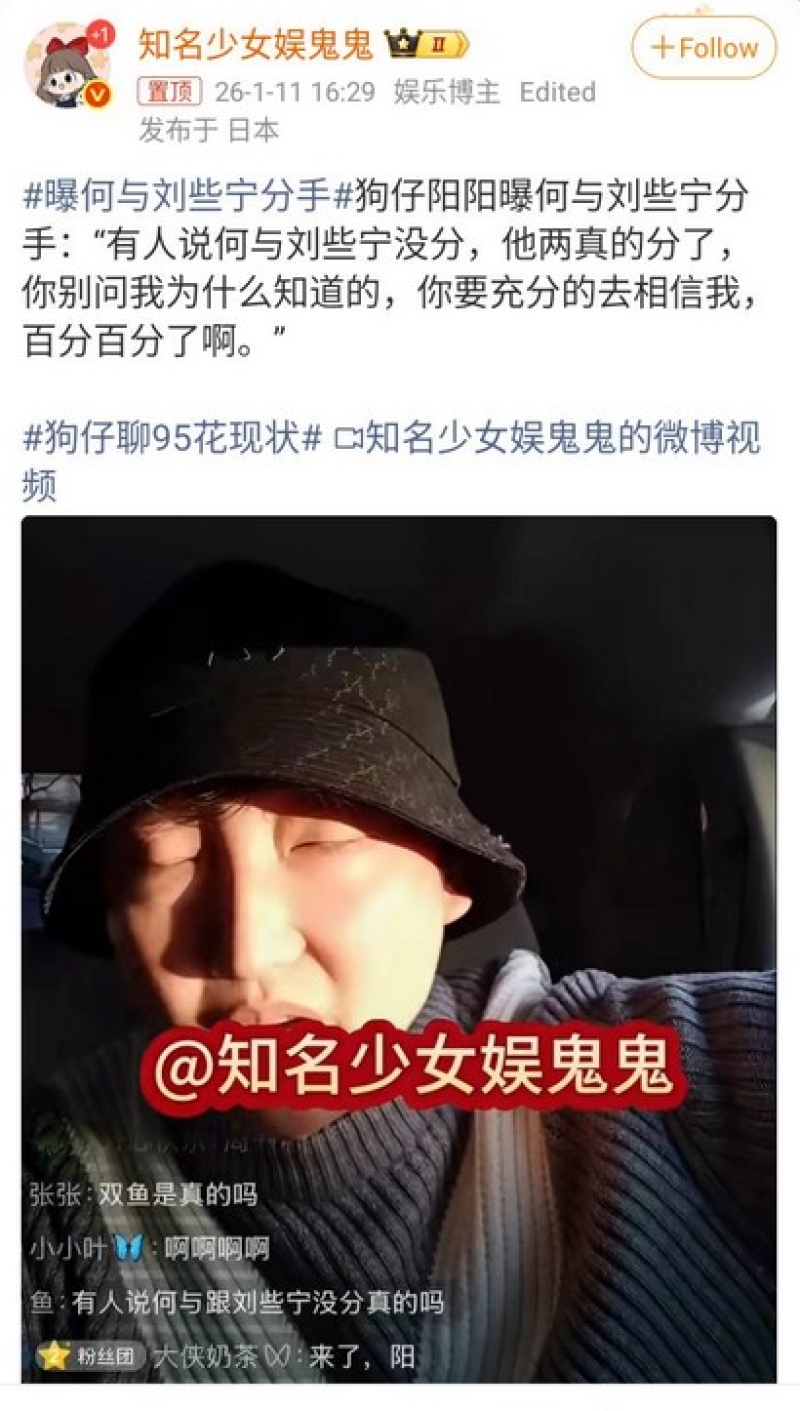 จากสื่อต่างประเทศ ได้รายงานว่า เมื่อวันที่ 11 มกราคม 2026 ปาปารัซซี่ชื่อดังในจีน “หยางหยาง” ออกมาไลฟ์สดและโพสต์บนเวยป๋อ อ้างว่า เหออวี่ และ หลิวเซี่ยหนิง “เลิกรากันแน่นอน 100%” พร้อมย้ำว่าไม่จำเป็นต้องตั้งคำถามถึงแหล่งข่าวของตน แต่กลับ ไม่ได้นำเสนอหลักฐานใดๆ ไม่ว่าจะเป็นแชต ภาพคู่ หรือคลิปวิดีโอ ทำให้ประเด็นนี้กลายเป็นที่ถกเถียงอย่างกว้างขวางในโลกออนไลน์