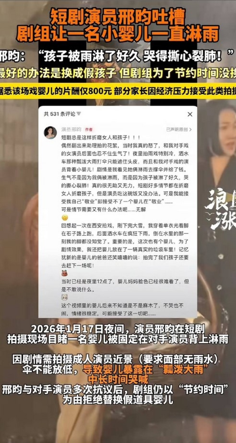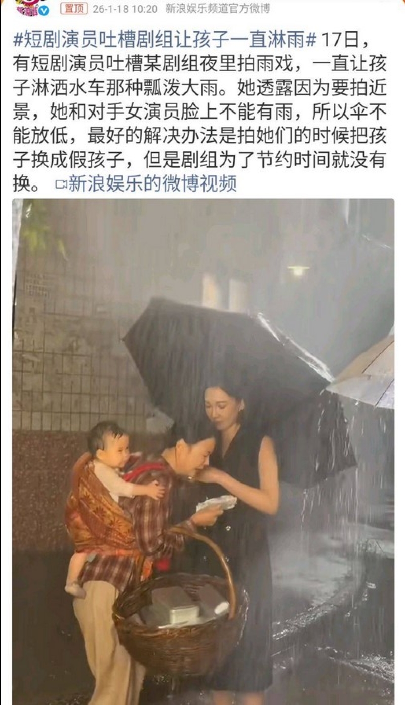 จากสื่อต่างประเทศ ได้รายงานว่า สิงอวิ๋น (邢昀) นักแสดงสาวชาวจีน ออกมาแฉความมืดมนของกองถ่ายละครสั้น ที่ให้ทารกตากฝนเทียมจากรถน้ำกลางดึกเป็นเวลานาน จนกลายเป็นกระแสวิพากษ์วิจารณ์ไปทั่วอินเทอร์เน็ตถึงจรรยาบรรณในอุตสาหกรรมบันเทิง