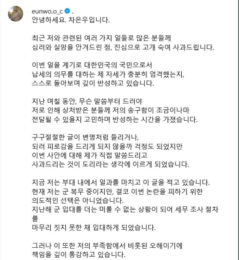ตลอด 11 ปีที่ผ่านมา ผมมีข้อบกพร่องมากมาย แต่ด้วยความรักและการสนับสนุนที่ไม่เปลี่ยนแปลงของทุกท่าน ผมจึงสามารถก้าวมาถึงตำแหน่ง "ชาอึนอู" ได้ ดังนั้น แม้ว่าผมอาจไม่สามารถตอบแทนความกตัญญูที่ได้รับจากทุกท่านที่เชื่อมั่นและสนับสนุนผม และผู้คนมากมายที่ผมได้ร่วมงานด้วย ผมรู้สึกเสียใจอย่างสุดซึ้งที่ทำให้ทุกท่านต้องเจ็บปวดและเหนื่อยล้า