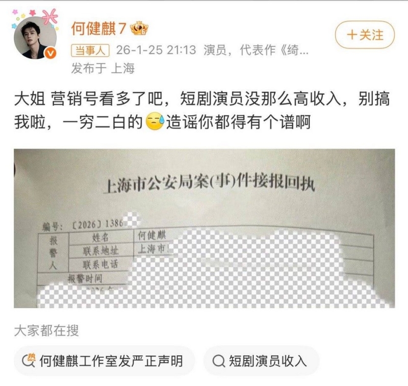 ล่าสุดทาง เหอเจี้ยนฉี โต้กลับ โดยสตูดิโอประกาศกร้าวว่าเป็นเรื่องโกหกและเป็นการหมิ่นประมาท พร้อมโชว์ใบแจ้งความจากตำรวจเซี่ยงไฮ้ และเจ้าตัวโพสต์ตัดพ้อว่า "รายได้นักแสดงซีรีส์สั้นมันน้อย จะกุเรื่องอะไรก็ให้มีขอบเขตหน่อย" พร้อมโชว์ผลตรวจปัสสาวะและเส้นผมเมื่อวันที่ 26 ม.ค. ที่ผ่านมา เพื่อยืนยันว่า "ช่วงนี้ไม่ได้เสพยา"