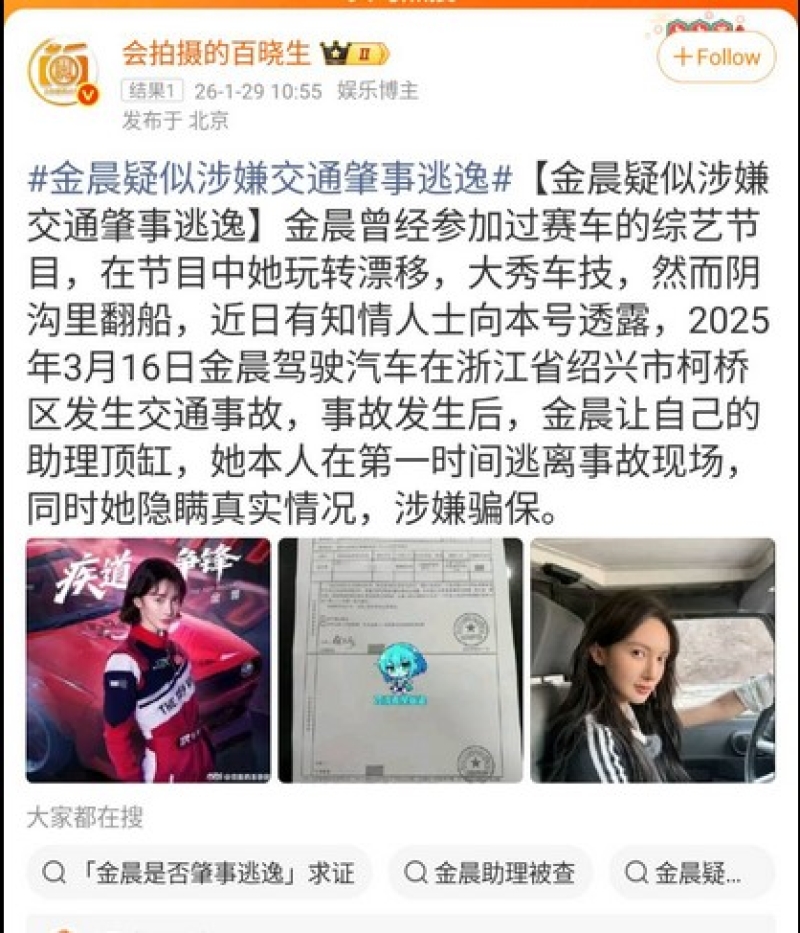 จาก ข่าวสารบันเทิงจีน ได้ออกมาเปิดเผยว่า กลายเป็นประเด็นร้อนฉ่ารับต้นปี 2026! เมื่อเหล่าบล็อกเกอร์สายบันเทิงจีนพร้อมใจกันขุดหลักฐานแฉ "จินเฉิน" (Jin Chen) นักแสดงสาวชื่อดัง ว่าเธออาจมีส่วนเกี่ยวข้องกับคดี "ชนแล้วหนี-สลับตัวคนขับ" ที่มณฑลเจ้อเจียงเมื่อปีที่ผ่านมา!