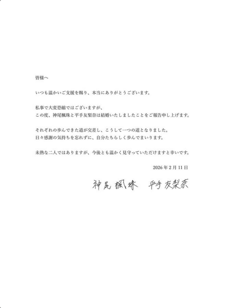 นับว่าเป็นข่าวดีรับวันวาเลนไทน์สำหรับวงการบันเทิงญี่ปุ่นเมื่อพระเอกหนุ่มฮอต คามิโอ ฟูจู (27 ปี) และศิลปินสาวมากความสามารถ ฮิราเตะ ยูรินะ (24 ปี) ประกาศแต่งงานสายฟ้าแลบในวันที่ 11 กุมภาพันธ์ 2026