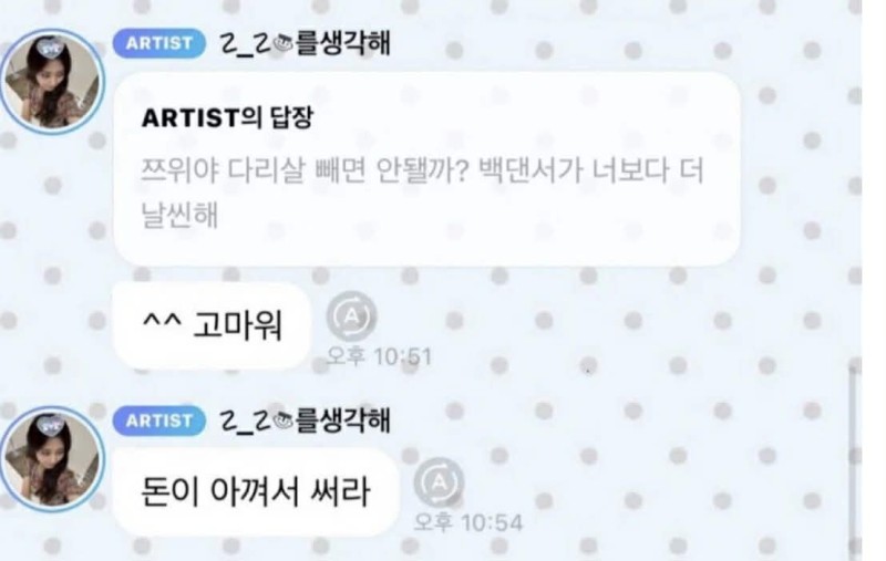 โดย ข้อความดังกล่าวพาดพิงถึงสัดส่วนช่วงขา พร้อมเปรียบเทียบกับทีมแดนเซอร์ จนหลายคนมองว่า เป็นการวิจารณ์ที่เกินขอบเขต เฉพาะเมื่อช่องทางนี้ ต้องเสียค่าสมาชิกรายเดือน เพื่อสื่อสารกับศิลปินโดยตรง