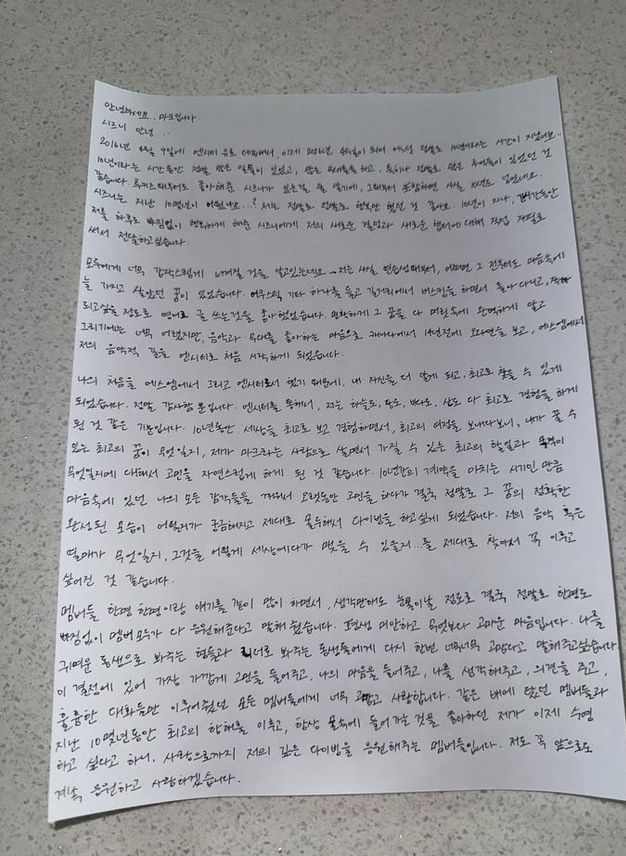 ล่าสุดเจ้าตัวได้ออกมาโพสต์จดหมายลายมือด้วยตนเองว่า หลังจากเดบิวต์กับ NCT และใช้เวลา 10 ปีในวง เขาตัดสินใจเริ่มต้นบทใหม่ในชีวิต เพื่อไล่ตามความฝันด้านดนตรีในแบบของตัวเอง แม้การตัดสินใจนี้จะกะทันหันและอาจทำให้แฟนๆ เสียใจ แต่เขายืนยันว่ารู้สึกขอบคุณทั้งสมาชิก วง ทีมงาน และแฟนๆ มากๆ ที่อยู่เคียงข้างมาตลอด