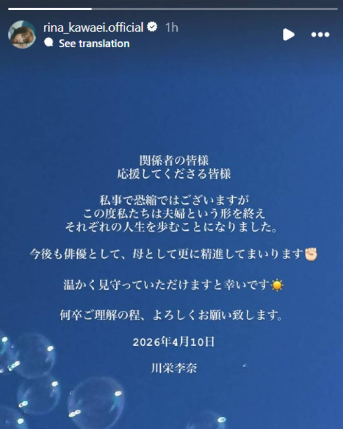 จากสื่อต่างประเทศ ได้รายงานว่า นักแสดงสาว"คาวาเอะ รินะ" และนักแสดงหนุ่ม "ฮิโรเสะ โท โมกิ" ออกมาประกาศยุติชีวิตคู่ผ่าน Instagram Stories พร้อมกัน เมื่อวันที่ 10 เมษายนที่ ผ่านมา