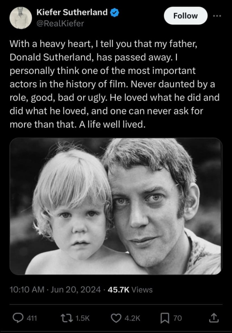 Kiefer Sutherland, ลูกชายของเขา กล่าวว่า "ผมขอบอกคุณด้วยหัวใจที่หนักแน่นว่า พ่อของผม โดนัลด์ ซูเธอร์แลนด์ เสียชีวิตแล้ว โดยส่วนตัวแล้วผมคิดว่าหนึ่งในนักแสดงที่สำคัญที่สุดในประวัติศาสตร์ของภาพยนตร์"