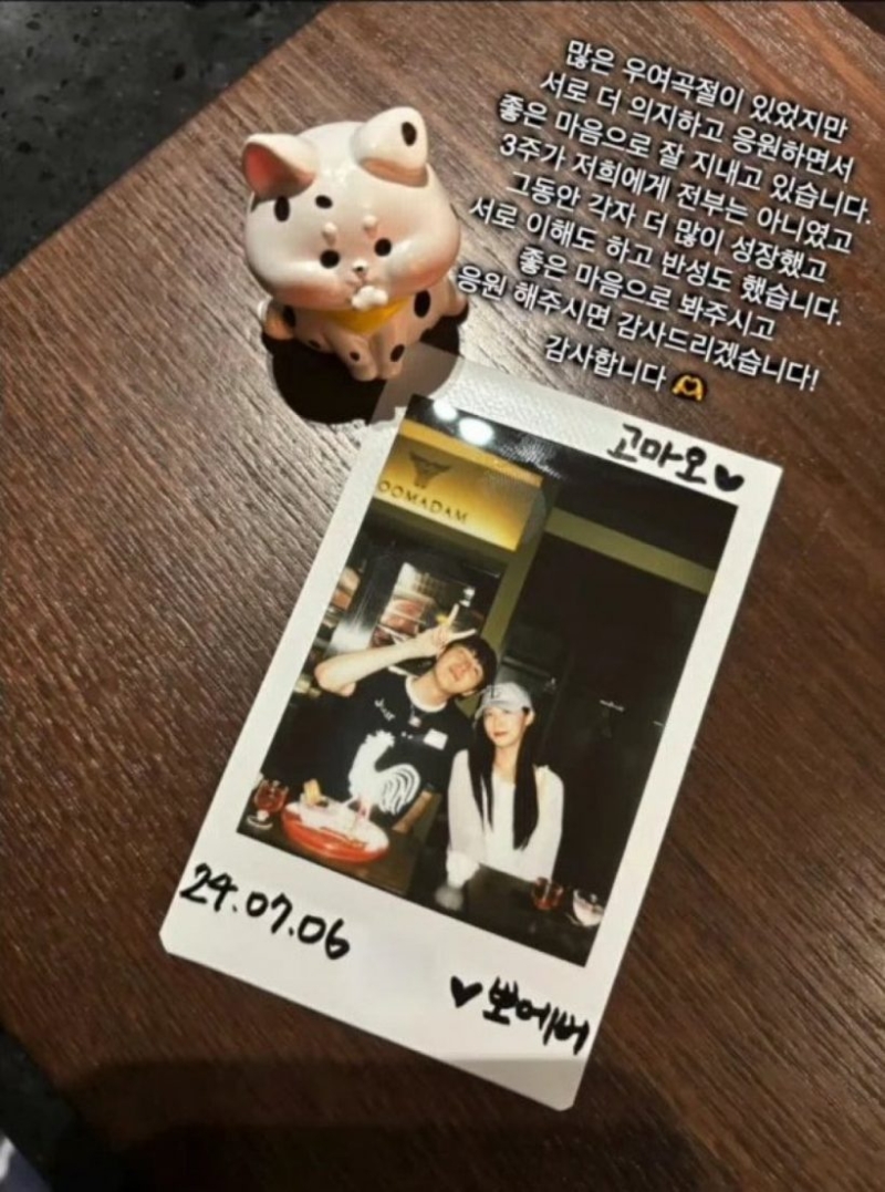 เมื่อวันที่ 17 กรกฎาคม 2024 ทั้งคู่ได้ประกาศผ่าน YouTube ส่วนตัวว่าพวกเขากลับมาคืนดีกันแล้ว "ถึงจะมีขึ้นๆ ลงๆ มากมาย แต่เราก็ยังรู้สึกดีต่อกัน คอยพึ่งพา และให้กำลังใจกัน สามสัปดาห์นั้น (ในรายการ) ไม่ใช่ทุกอย่างสำหรับเรา และหลังจากนั้นเราก็เติบโตมากขึ้น คิดทบทวน และเข้าใจกันมากขึ้น โปรดมองเราในแง่ดีและเราจะขอบคุณหากคุณสามารถให้กำลังใจเรา ขอบคุณ.