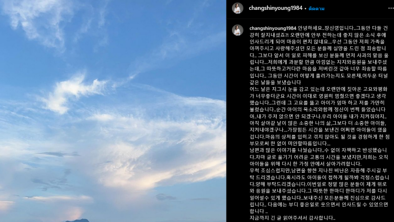 ล่าสุด จางชินยอง ได้โพสต์ผ่านอินสตาแกรม ได้โพสต์กล่าวขอโทษที่ทำให้แฟนคลับที่คอยสนับสนุนเกิดความผิดหวัง และได้รับความเจ็บปวด เธอได้แชร์วิธีการปกป้องลูกๆ และตัดสินใจยืนหยัดอยู่เคียงข้างสามี และขอบคุณทุกการสนับสนุน